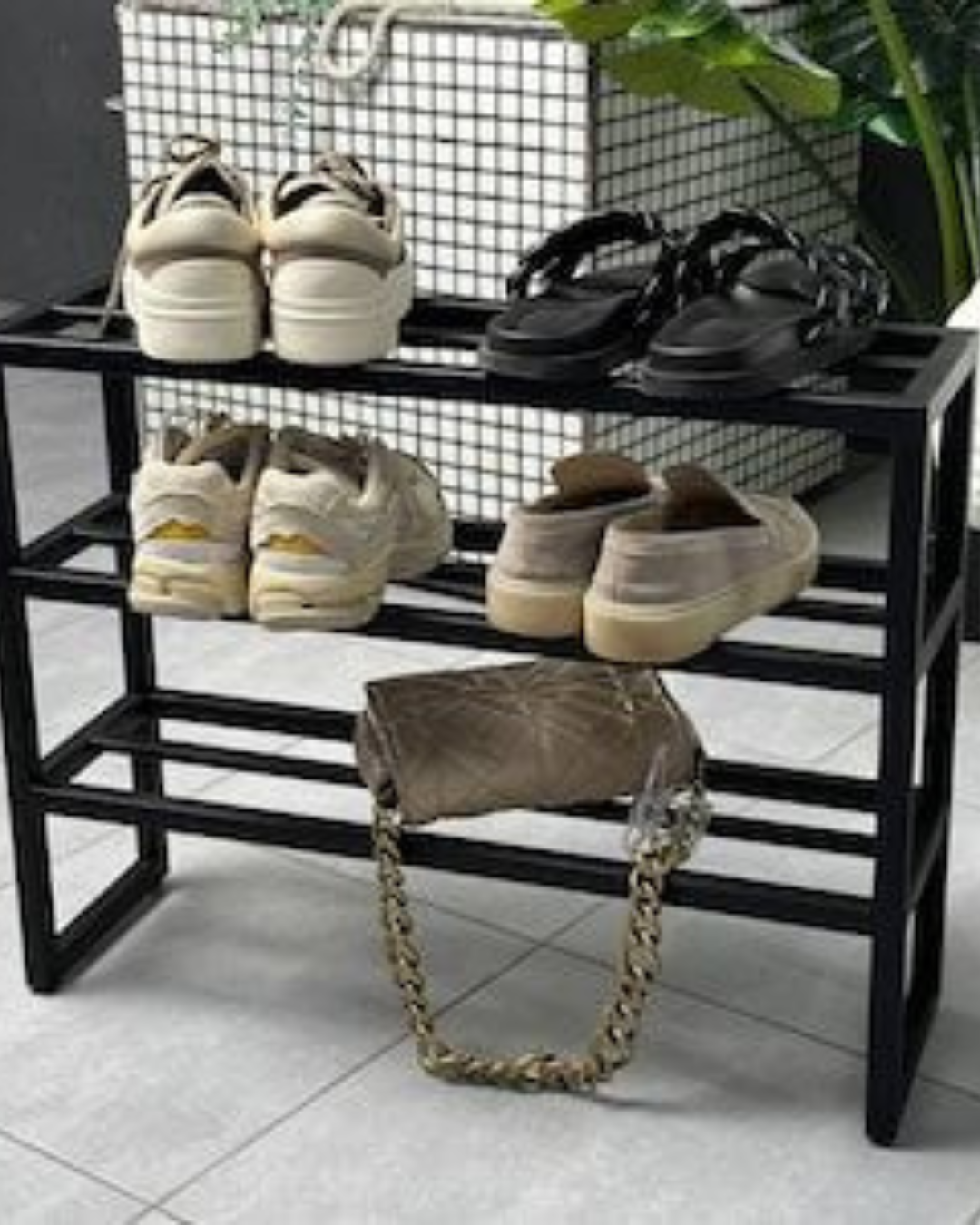 Stylish and durable metal shoe rack designed to organize multiple pairs of shoes neatly in your home.